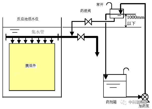 (2)膜元件的藥液清洗(頻率:同一過濾流量下跨膜壓差比初期穩(wěn)定運行時的跨膜壓差高5kPa時,或者每半年一次,擇兩者間更短時間內(nèi)進行一次藥液清洗。)